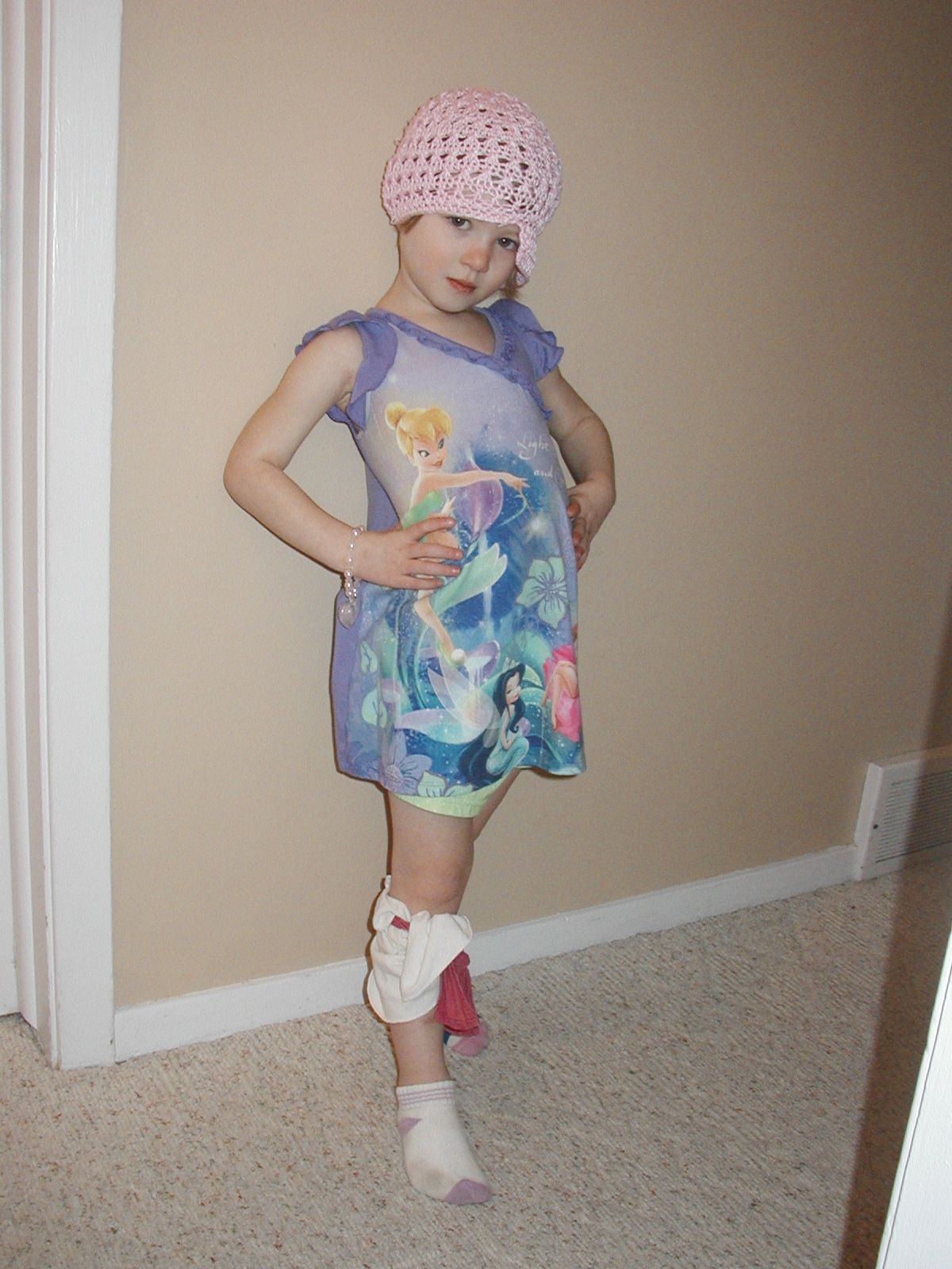 and I can't decide if it's funny or disturbing. A week or two ago Anne woke up, beautified herself with a hat, bracelet, her favorite mismatched socks (with blue masking tape around one for extra beauty), and a washcloth tied around her leg. It was cute, so I got out the camera to take a picture, and she strikes a pose. She's three years old, people. And MY (I'm the person children sometimes mistake for a boy) daughter.